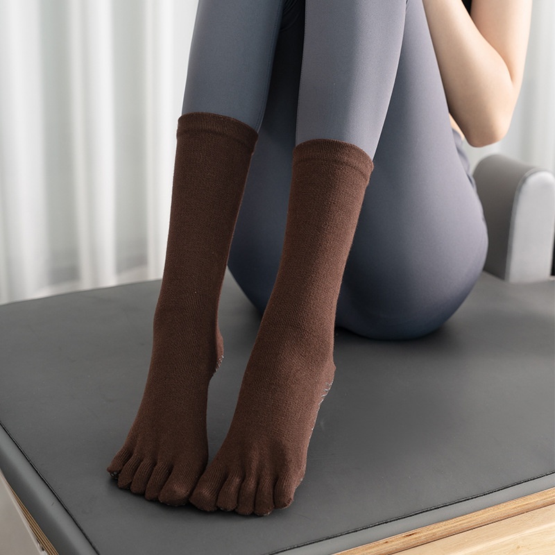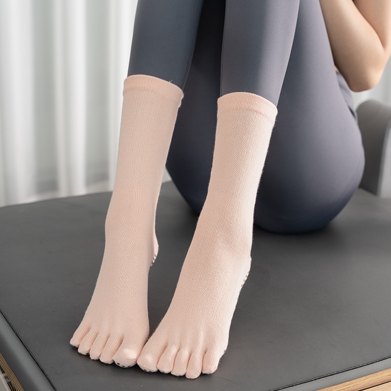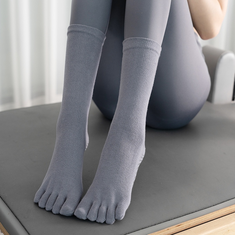 Chaussettes de yoga et de pilates mi-mollet pour femmes, style sport, à dégradé de couleurs, orteils séparés, absorbantes et antidérapantes. Modèle professionnel.