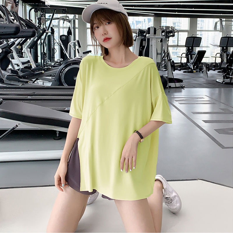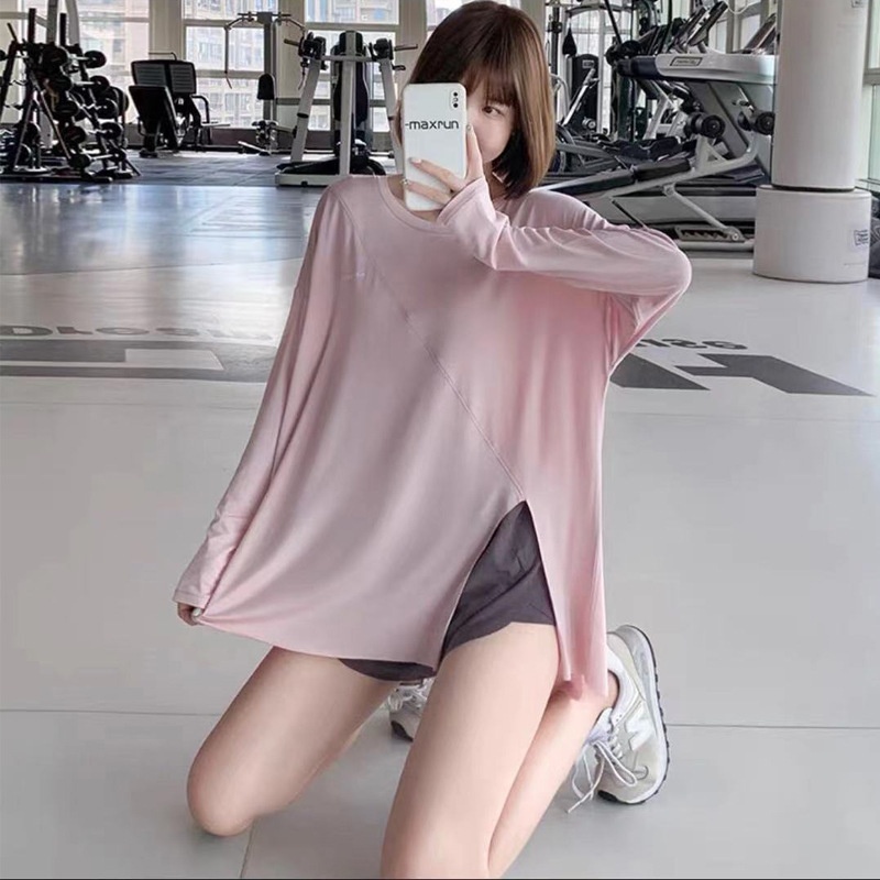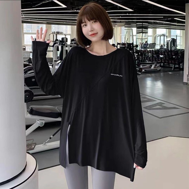 T-shirt de yoga à séchage rapide 001 avec fente, haut de sport ample pour femme, idéal pour la course à pied, grande taille, vêtements de fitness à manches longues