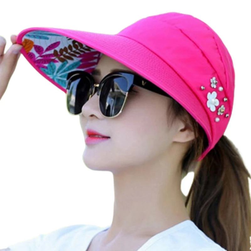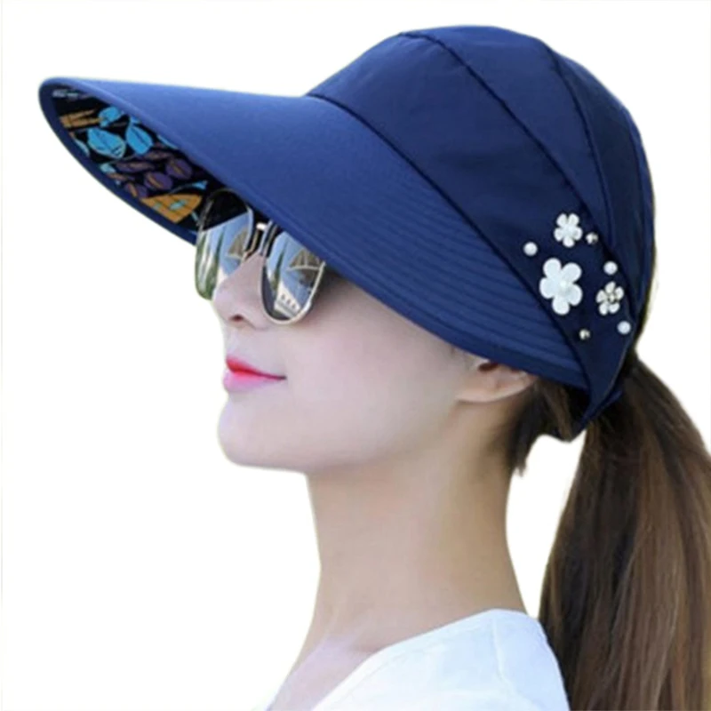 2023 été chapeaux pour femmes pliable à long bord chapeau de soleil perle fleur visière crème solaire disquette casquette femme en plein air décontracté