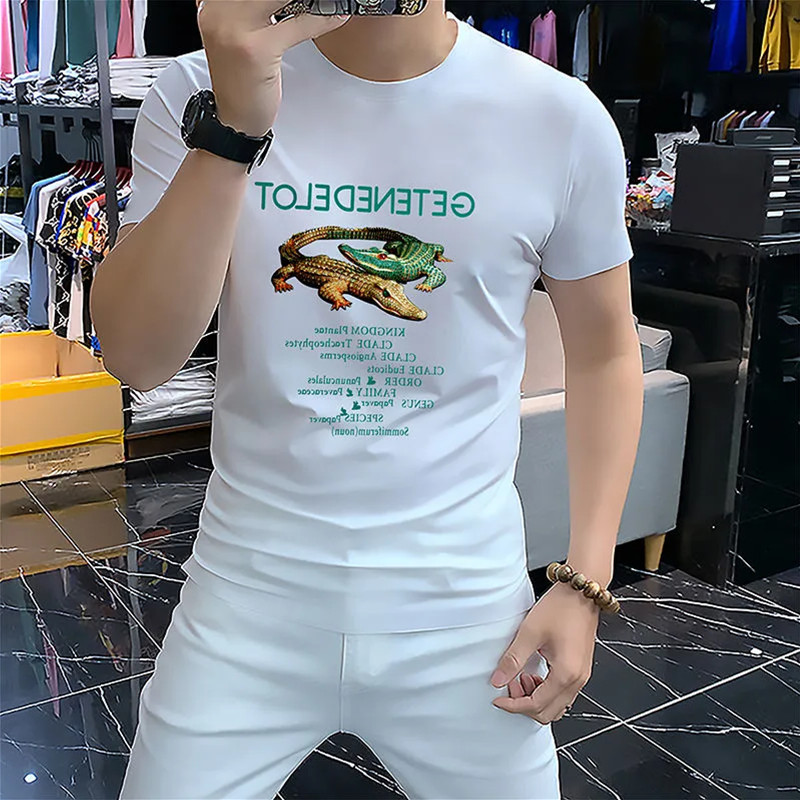 2023 Summer Men's Short sleeved Round Neck Shirt Printed Handsome Korean Edition Crocodile Net Red Slim Fit Top Trendy Men