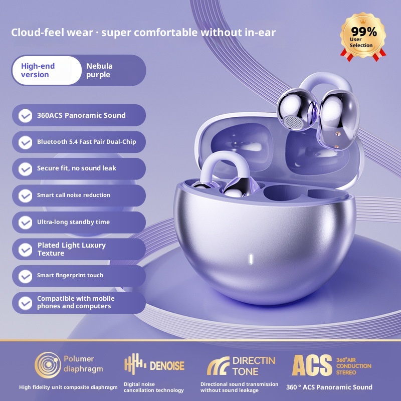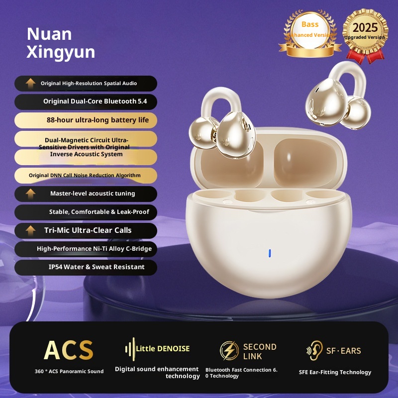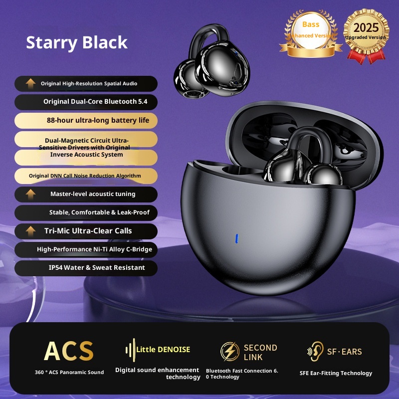 Brand:Neutral,Transmission Range:10m,Functionality:Ultra-long battery life, call function, supports music playback,Bluetooth Protocol:5.4,How to use:Clip-on Earrings,Is it single or double ear?:Bilateral Stereo Sound,Color:Purple, Skin Color, Black, Purple AI Translation Version, Skin Color AI Translation Version, Black AI Translation Version,Main downstream platforms:, , , , Independent Station, , Others,Main sales regions:Africa, Europe, South America, Southeast Asia, North America, Northeast Asia, Middle East, Others,We have authorized private labels available:yes,Is it exclusively for cross-border export supply?:yes,Customizable:Support,Type:Neutral color box packaging,Is it a patented source product?:No,Mold Type:Private Model,What type of chip is it?:Zhongke Lanxun,Battery life:4-8 hours,Year/Season of Release:2025,Style:Sporty style,Waterproof performance:Waterproof for Daily Use,Material:PC+ABS
