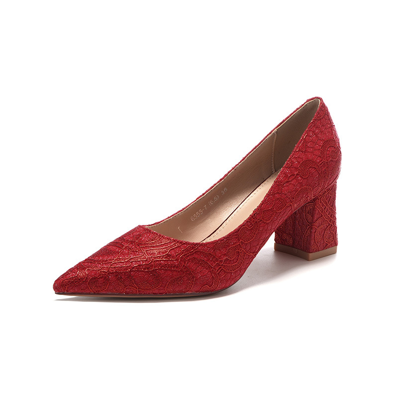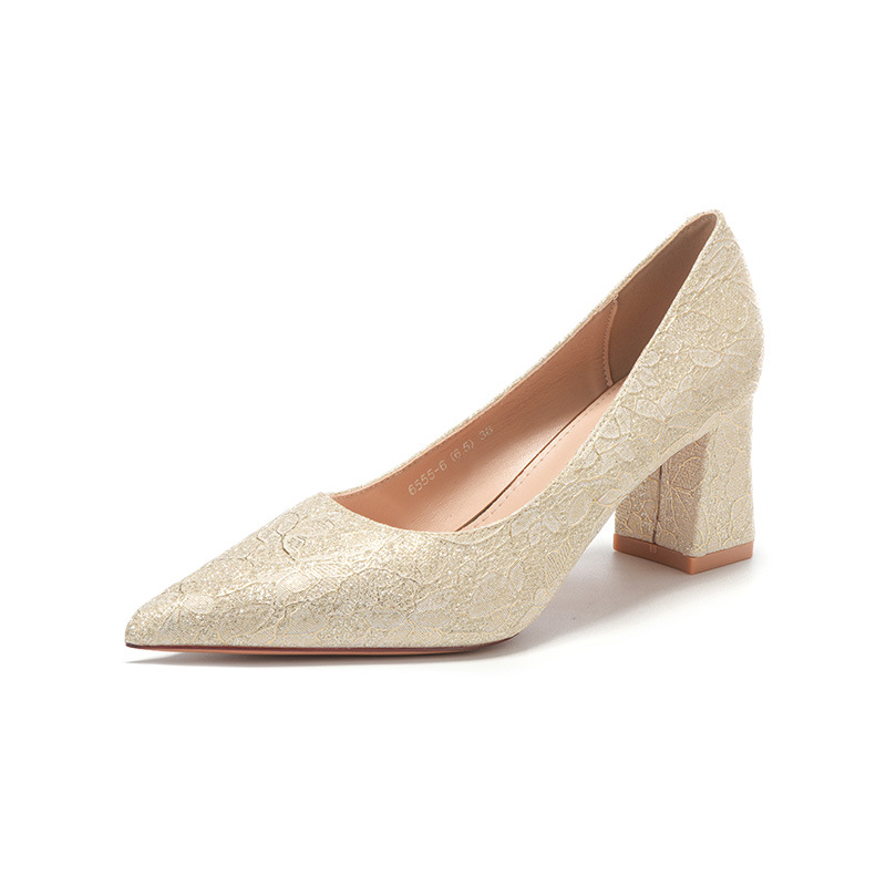 6555G Pointed Toe Women's High Heels Wedding Shoes Chunky Heel Bridal French Lace 2023 New Shallow Mouth Single Shoes