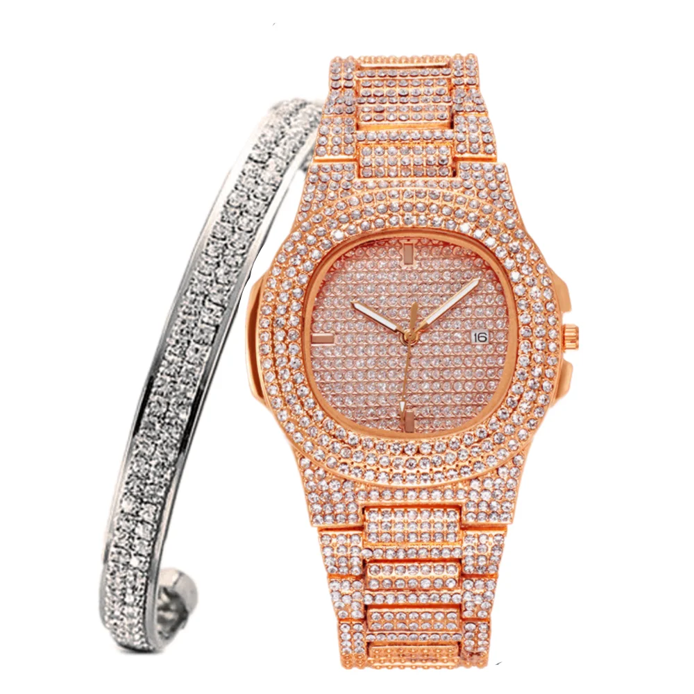 Watch + Bangle for Women Bling Miami Bracelet Iced Out Watches Women Hip Hop Watch Gold Watch Set Women Jewelry Set Gifts