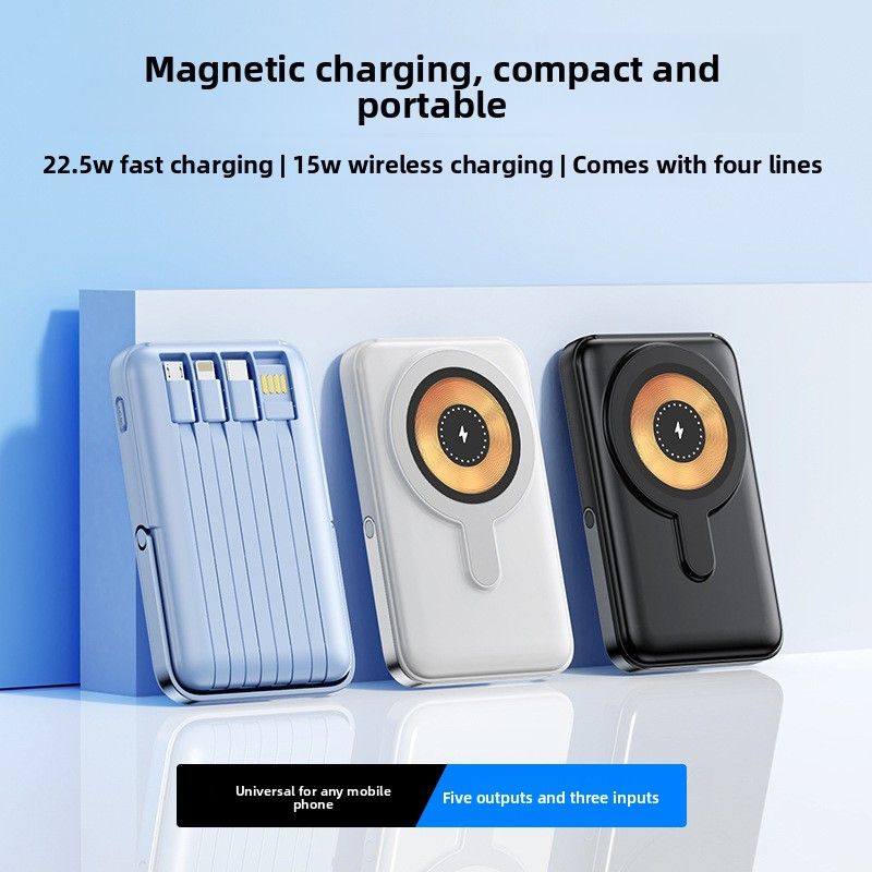 Batterie externe transparente avec chargeur magnétique 22,5 W et sans fil 15 W à charge rapide, support intégré à quatre fils.