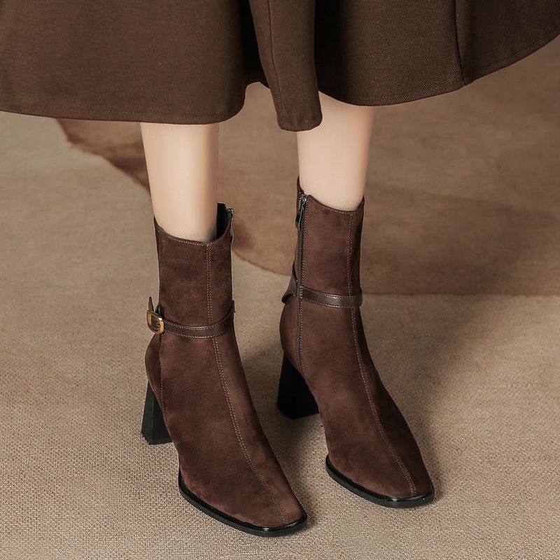 Bottes amincissantes en daim pour femme, nouvelle collection automne-hiver, fermeture éclair latérale courte, talon épais, bout carré, boucle, marron Melad