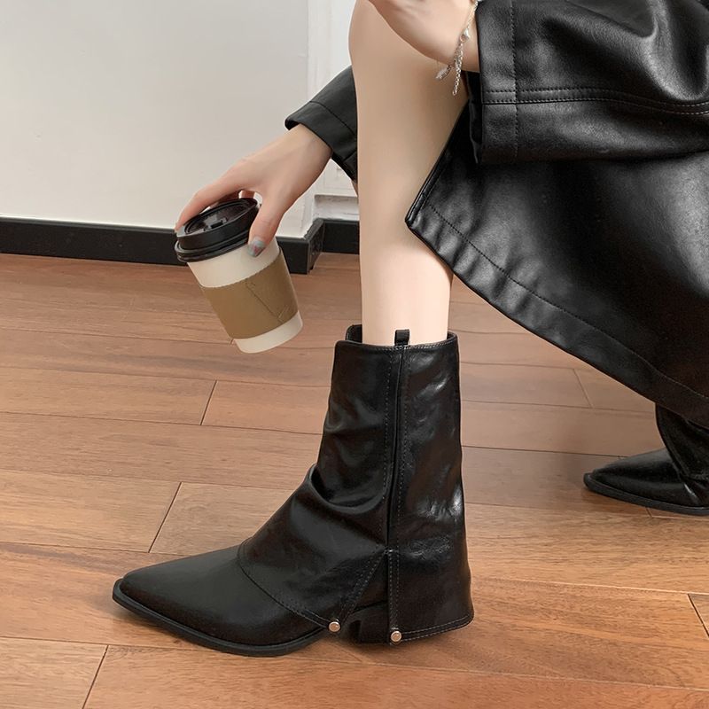 2025 Autumn Winter Women's Mid-Calf Pointed Toe Chunky Heel High Heel Short Boots Hot Girl Metal Leg Boots Slimming