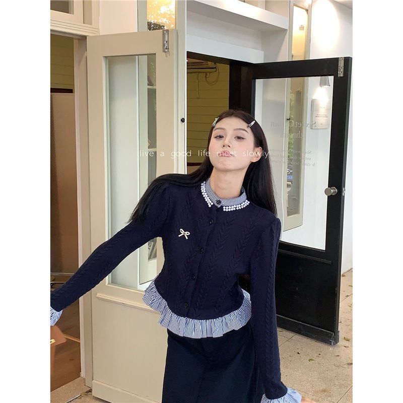 Cardigan tricoté à manches longues et jupe longue pour femme, style français, patchwork rayé, élégant, nouvelle collection automne 2024