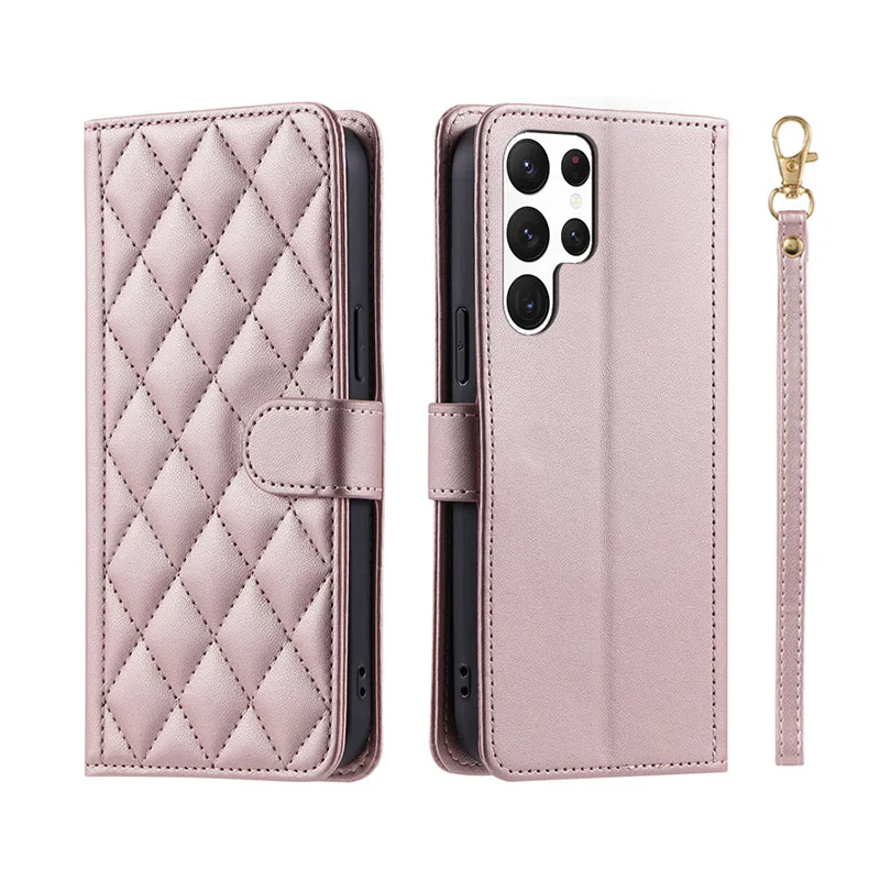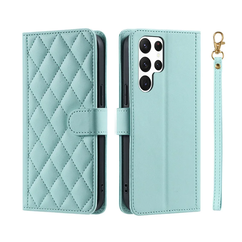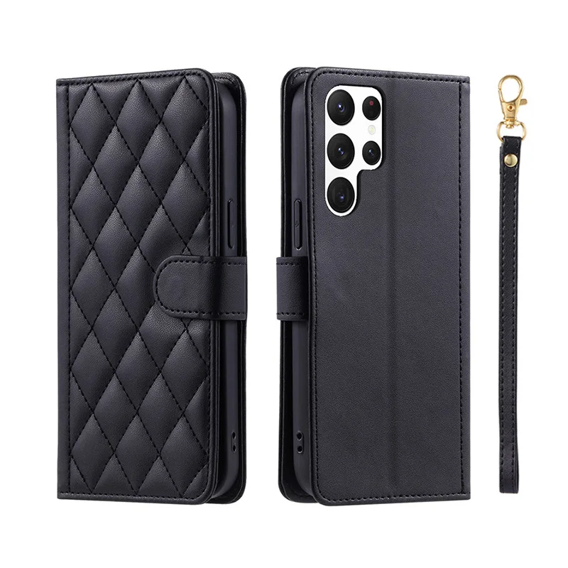 Étui portefeuille en cuir à carreaux pour Samsung Galaxy S25 S24 S23 S22 S21 S20 FE S10 Note 20 Ultra 10 Plus 9 8 Housse de téléphone à rabat avec lanière