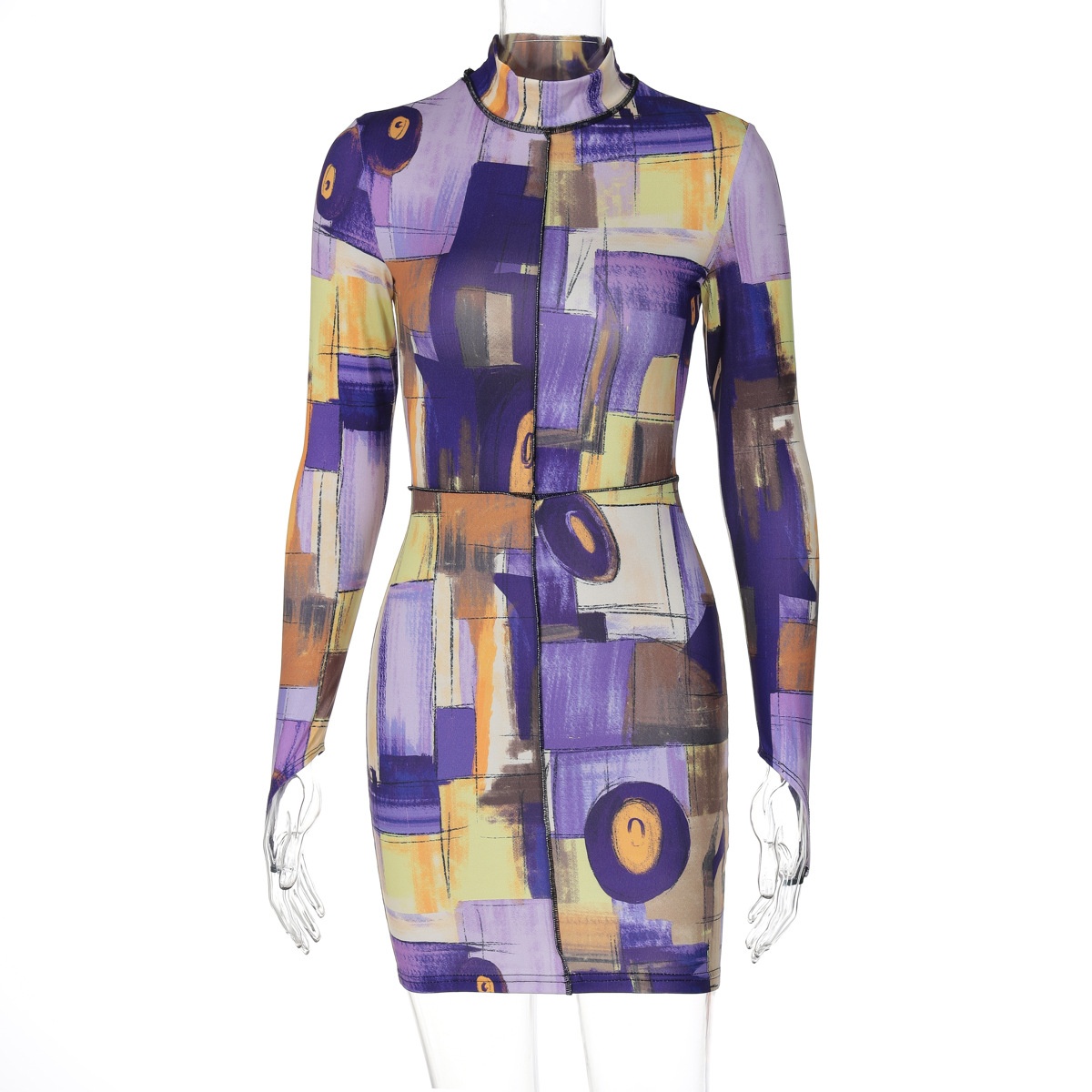 ChicShe Collection Printemps 2025 - Robe moulante courte à manches longues et col montant, imprimé peinture à l'huile, collection femme, vente en gros