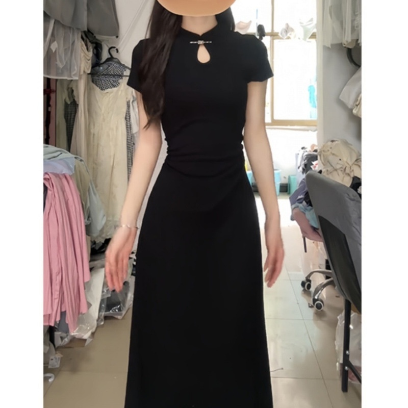 Cheongsam noir à manches courtes style traditionnel chinois ChicShe pour femme, collection été 2025, nouvelle taille S, coupe cintrée
