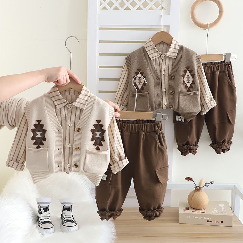 Children's and boys' spring clothing set 2025 new style baby spring and autumn fashion men's baby sweater cardigan three piece set