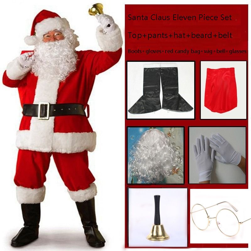 Color: Santa five-piece set, Santa six-piece set -- boot cover, Santa seven-piece set -- boot cover + gloves, Santa eight-piece set -- boot cover + gloves + red candy bag, Santa nine-piece set -- boot cover + gloves + red candy bag + wig, Santa ten-piece set -- boot cover + gloves + red candy bag + wig + bell, Santa eleven-piece set -- boot cover + gloves + red candy bag + wig + bell + glasses