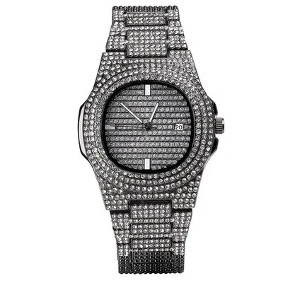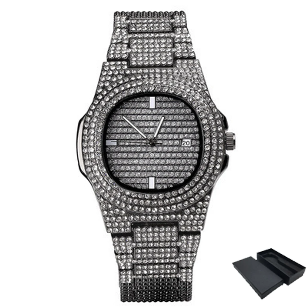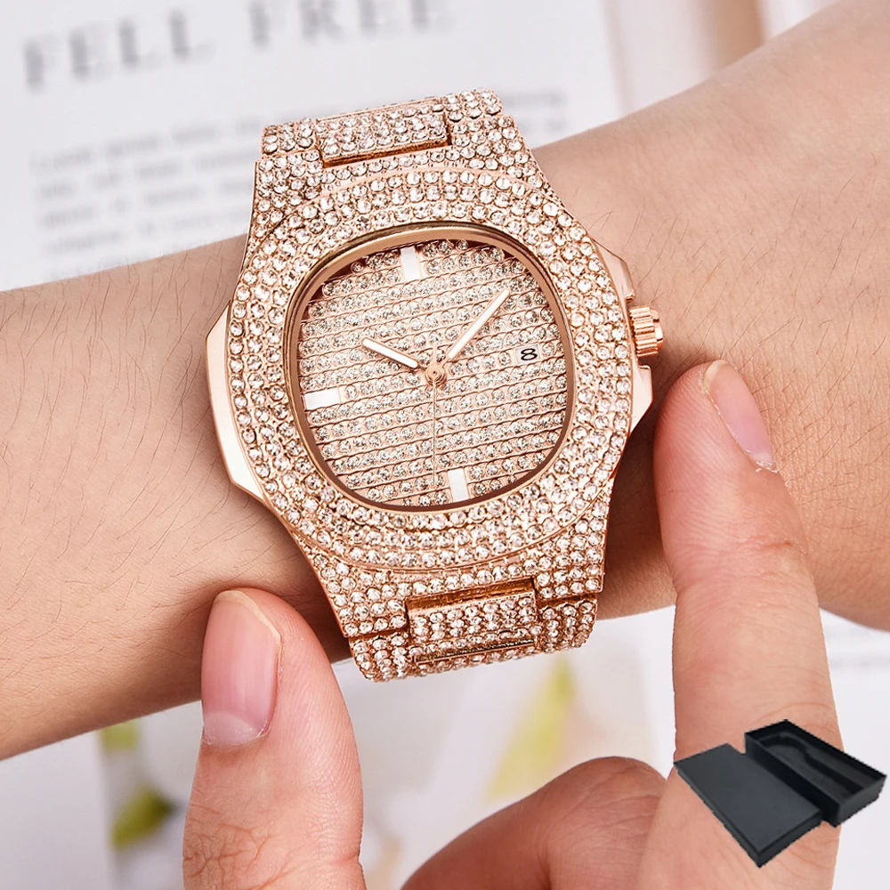 Mens Watches Fashion Diamond Auto Date Quartz Wrist Watch Men Gold Full Stainless Steel Business Mens Watches Top Brand clock drop shipping.