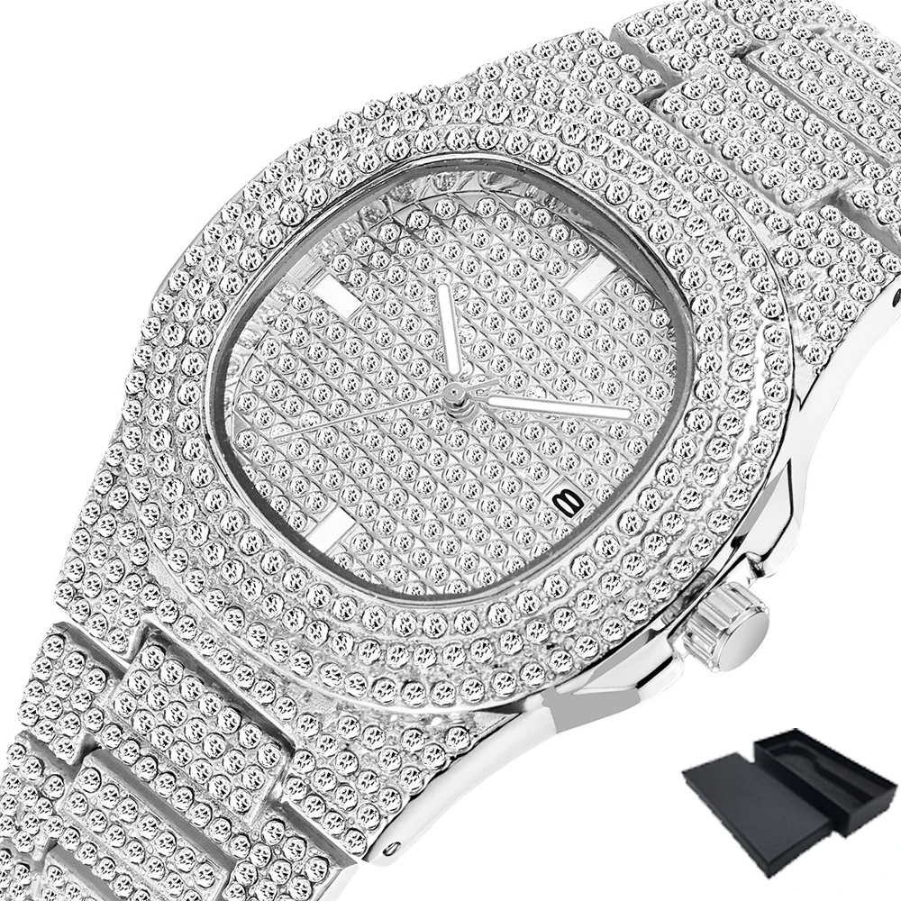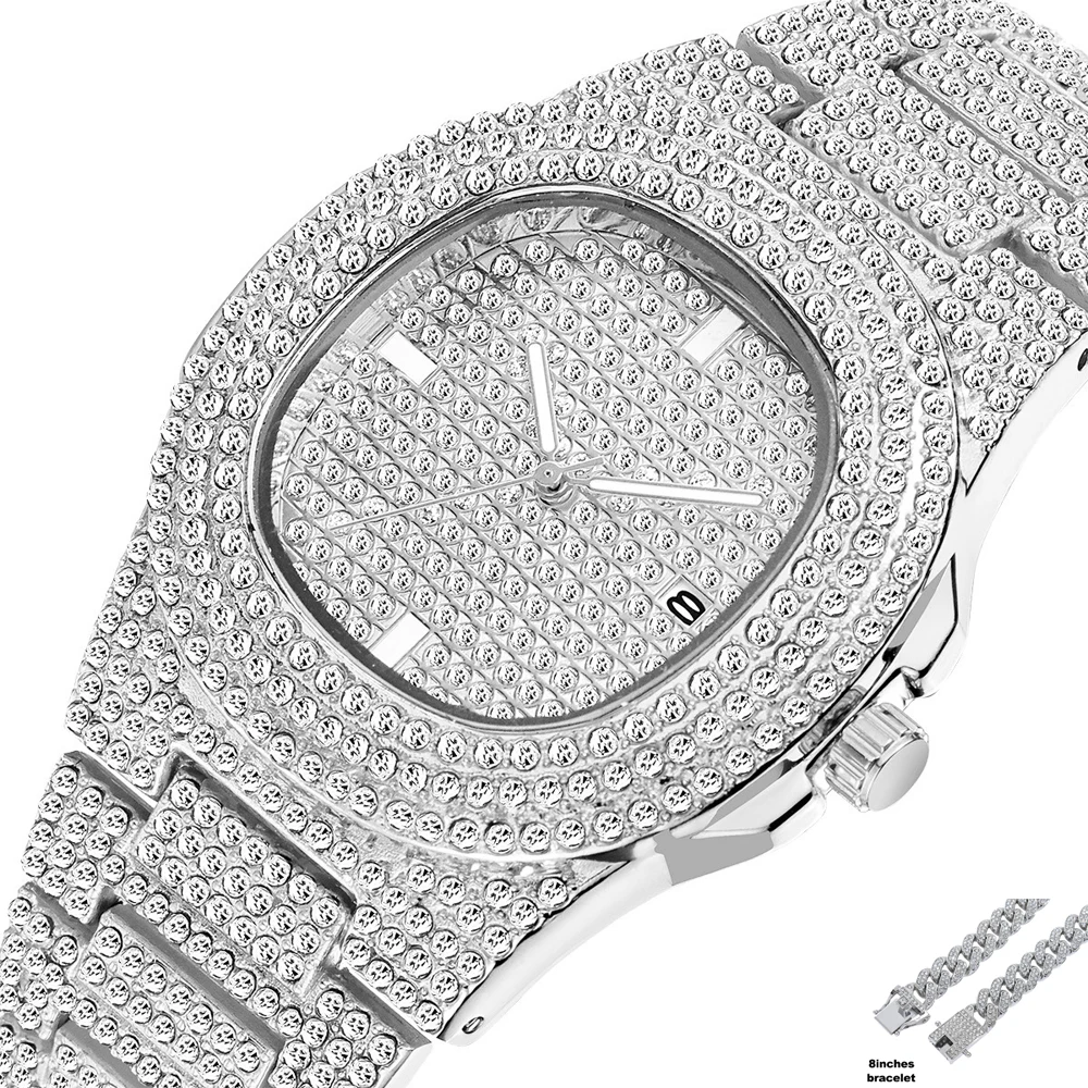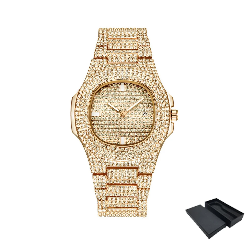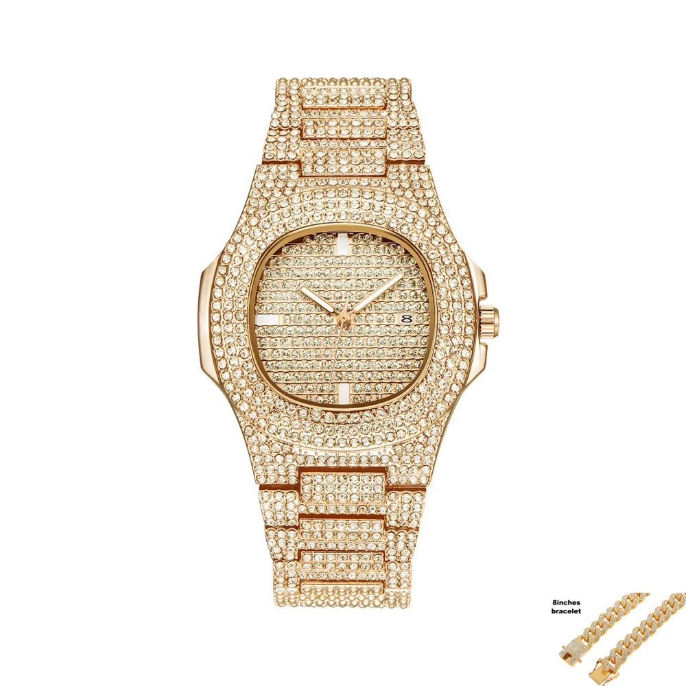 Ensemble de montres en diamant scintillant pour hommes, style Hip Hop, chaîne cubaine, à Quartz glacé, en or, livraison directe