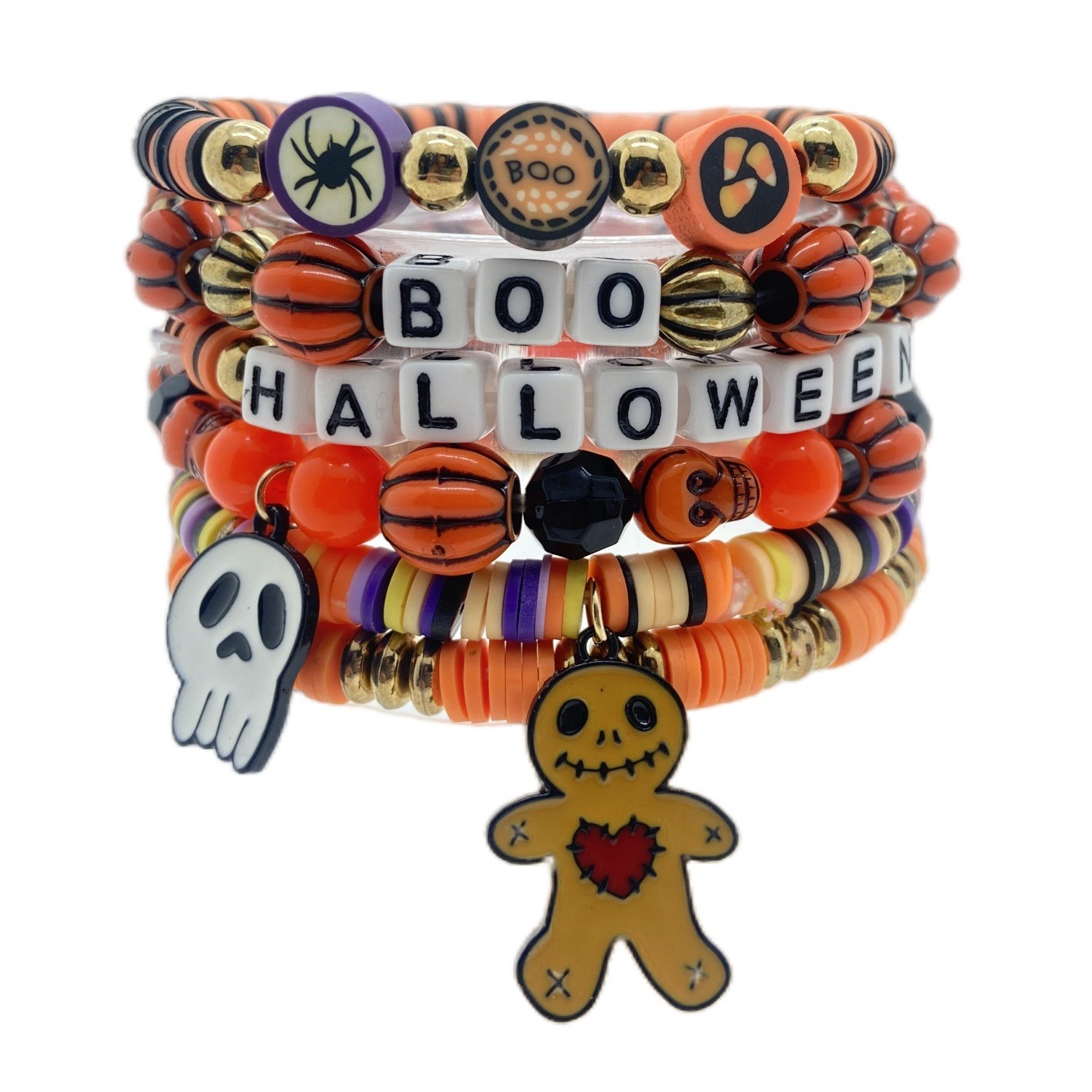 Halloween Glow-in-the-dark Bracelet Pumpkin Ghost Spider Bat Polymer Clay Hand-beaded 6 Bracelets, Halloween Gift
