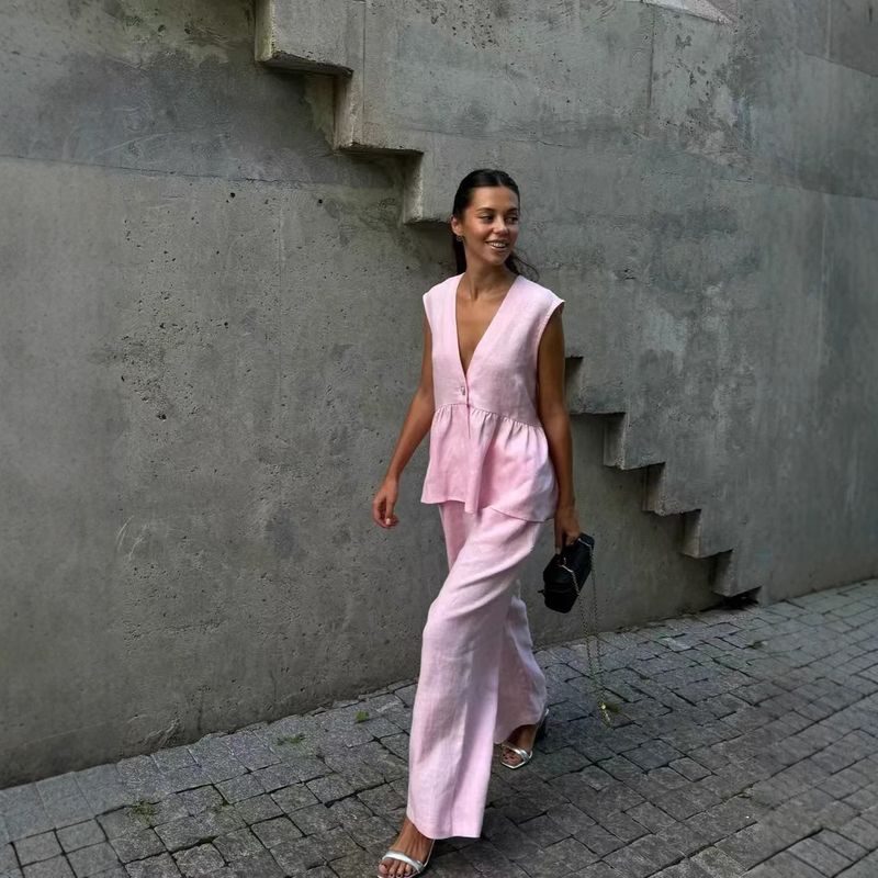 Ensemble deux pièces en coton 2025, haut sans manches, gilet et pantalon long, col en V, boutons, couleur unie, élégant, pour les déplacements quotidiens