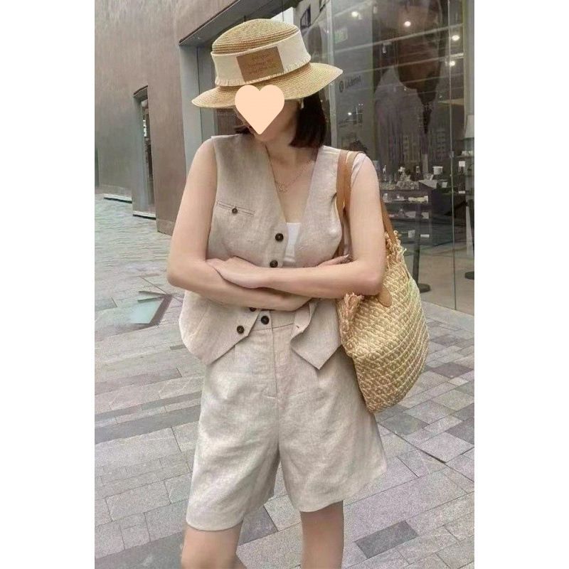 Ensemble deux pièces en lin tendance pour femme, blazer sans manches, gilet et short large, nouvelle collection été 2025