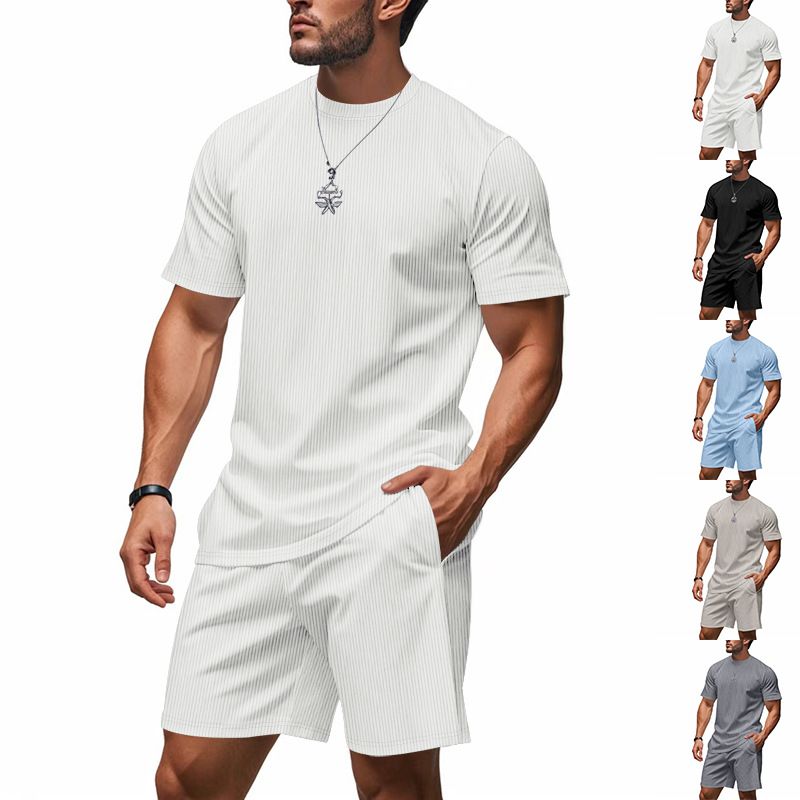Ensemble short et short à manches courtes et col rond pour homme, style américain, décontracté, simple, respirant, côtelé, ample, été 2025