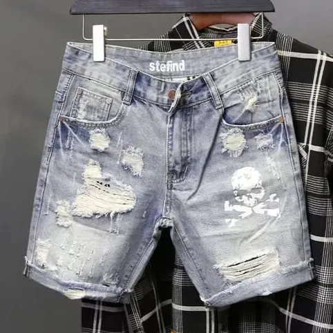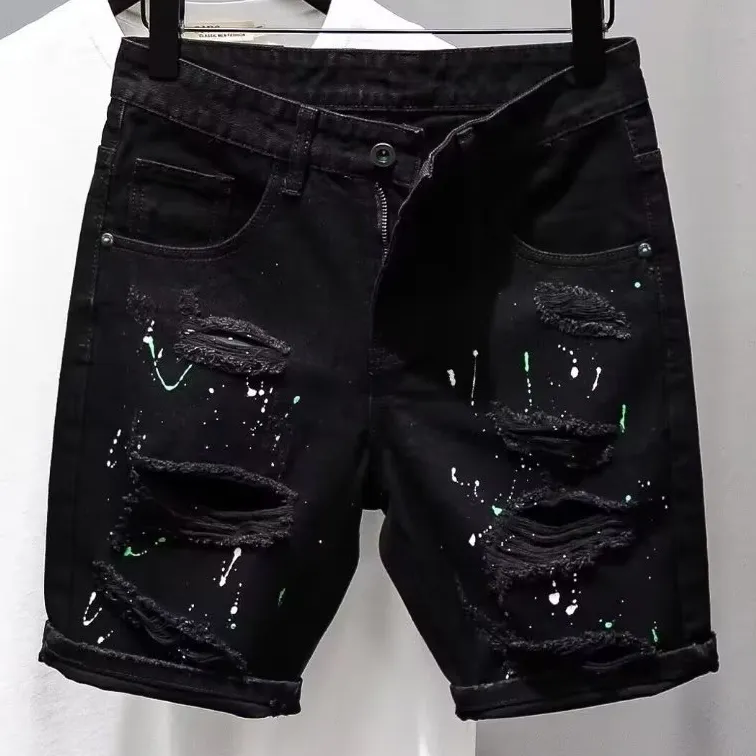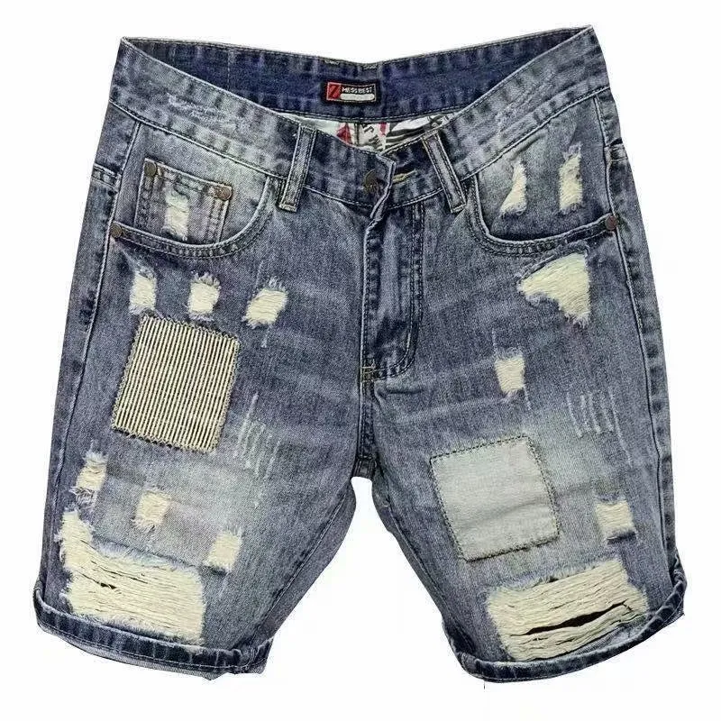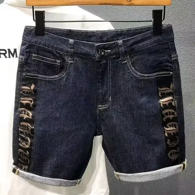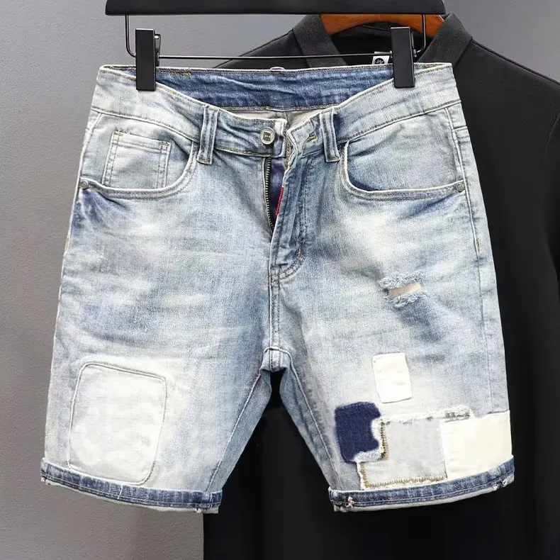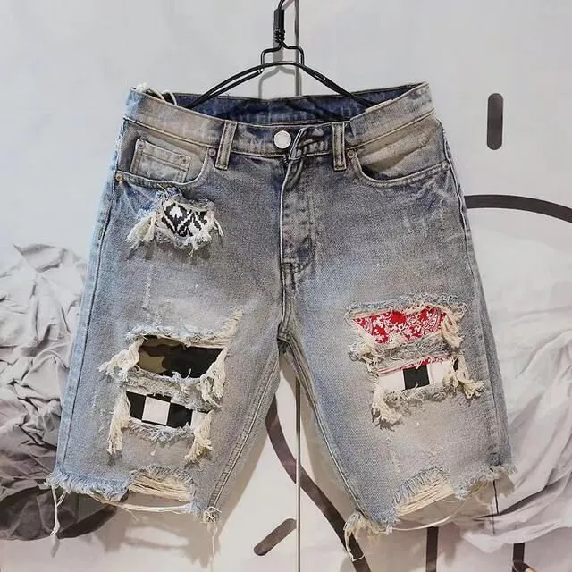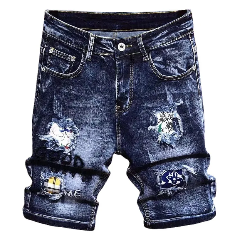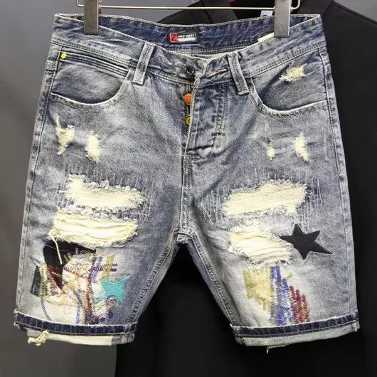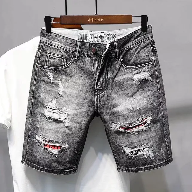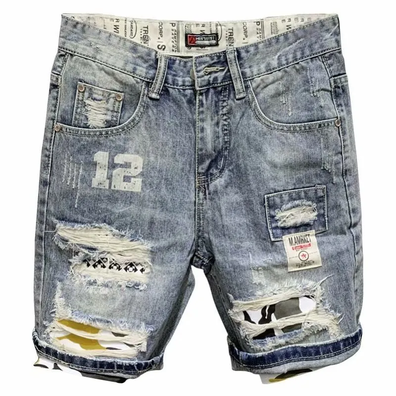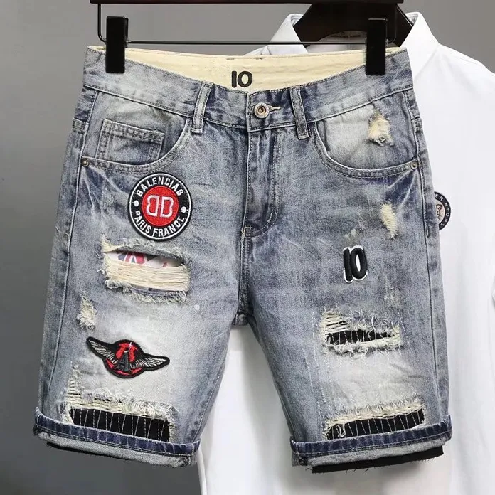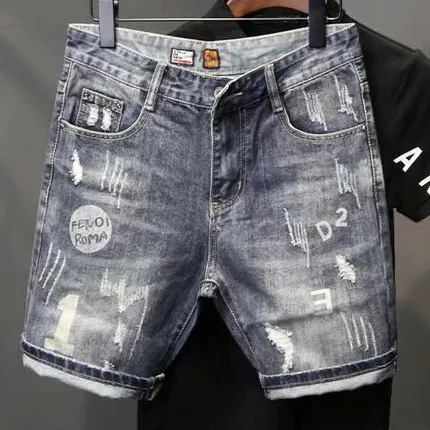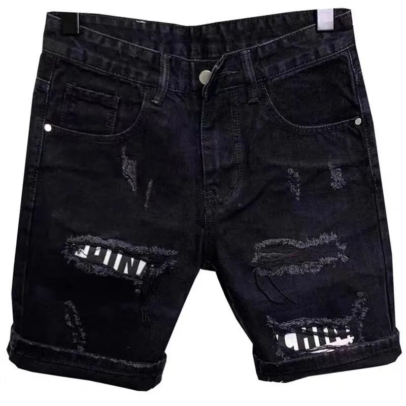 Short tendance pour homme, jeans droits, serrés, décontractés, hip hop, street, pantalon déchiré, patch, lettre imprimée, denim