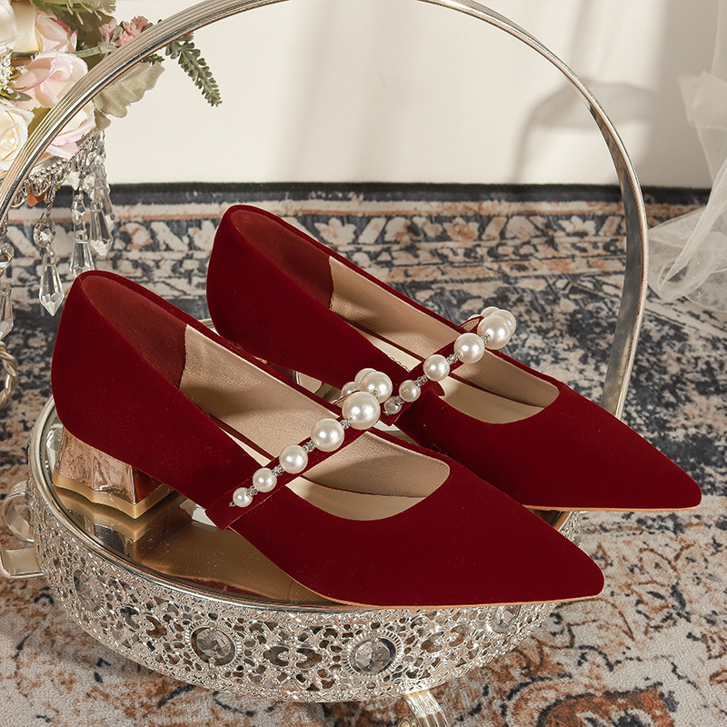 French Pearl Mary Jane Chaussures Printemps Niche Pointu En Peau De Mouton Chaussures Simples Femmes Couleur De La Peau Talons Épais Fond Plat Chaussures De Demoiselle D'honneur