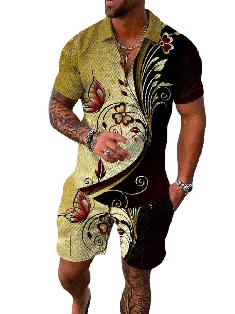 Gold 3D Fashion Zipper Polo Shirt Set for Men's Casual 3D Printed Polo Shirt Shorts 2-piece Set