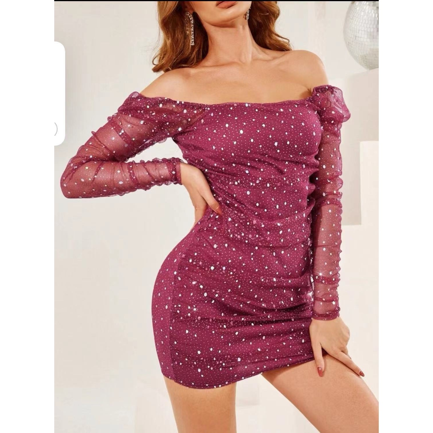 GraceChic GraceChic Cross-Border Nouvelle Mode Femme Col Carré Manches Longues Taille Cintrée Maille Transparente Sexy Paillettes Short Européen Et