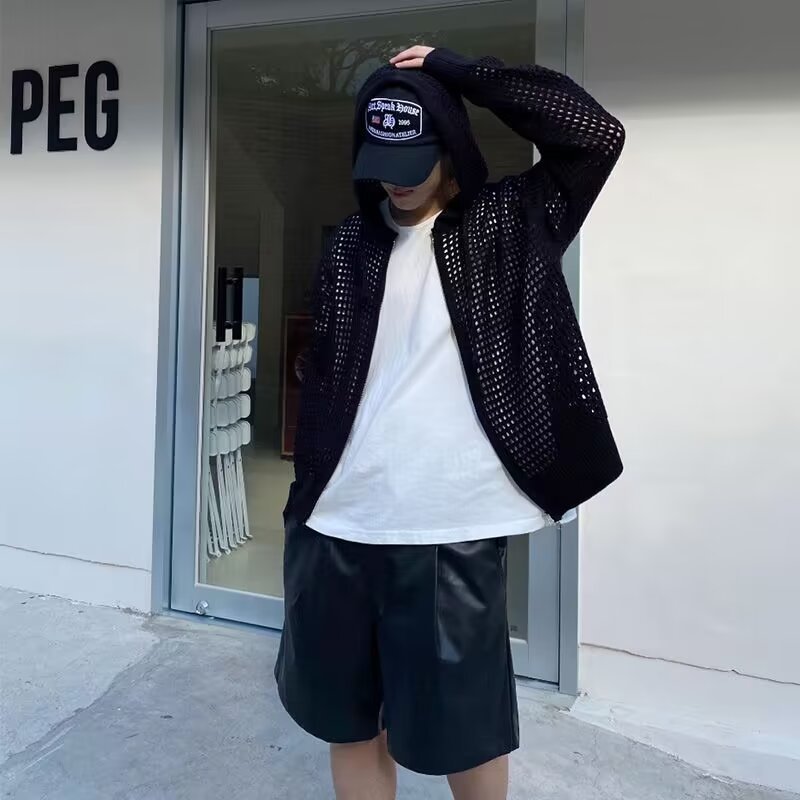 High end cardigan sweater for men's ins high street hooded hollow out knit sweater for summer thin sun protection couple outfit jacket