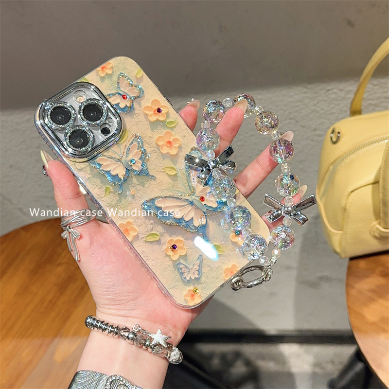 Ins Blue Water Diamond Butterfly is suitable for iphone 15Pro Max phone case, iPhone 13 wristband chain, 16 new models, 12 high-end and niche, 14 promax internet famous super hot protective case for women