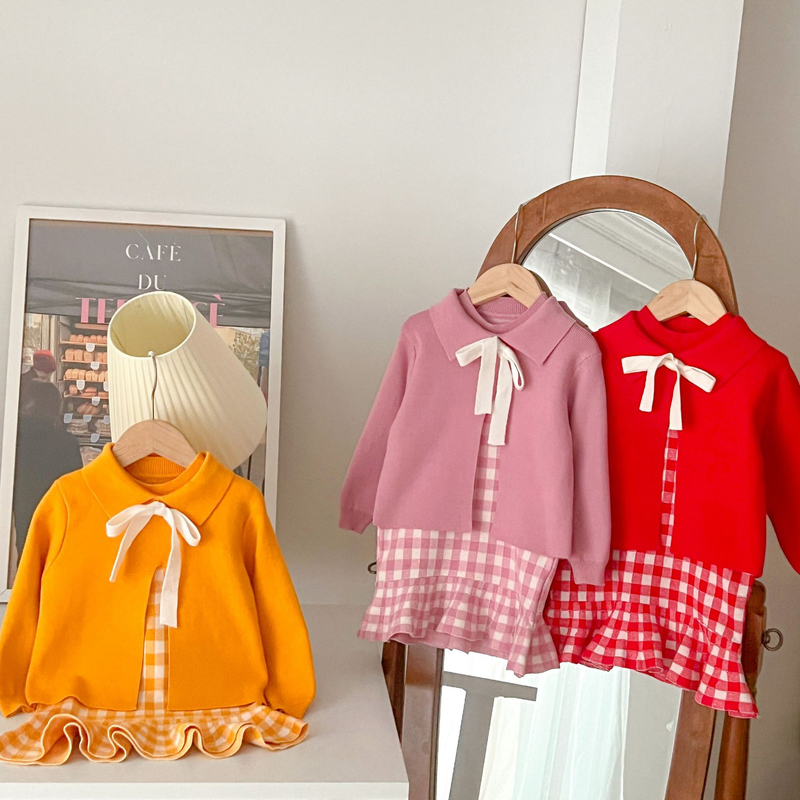 JINYONG Girls' Fashionable Knitted Sleeveless Ruffle Edge Dress Two piece Set of Internet Red Girls' Sweater Set Skirt