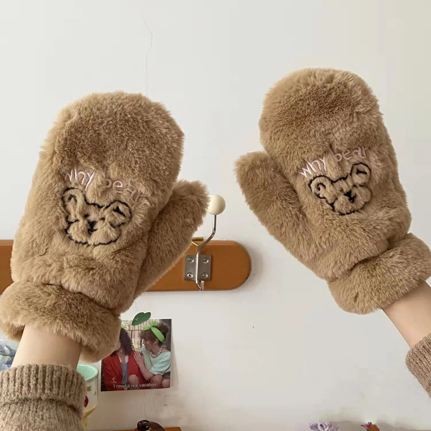 Kawaii Plush Warm Gloves Soft Winter Thick Fingerless Korean Japanese Bear Gloves With Ropes Casual Outdoor Riding Mittens Warm