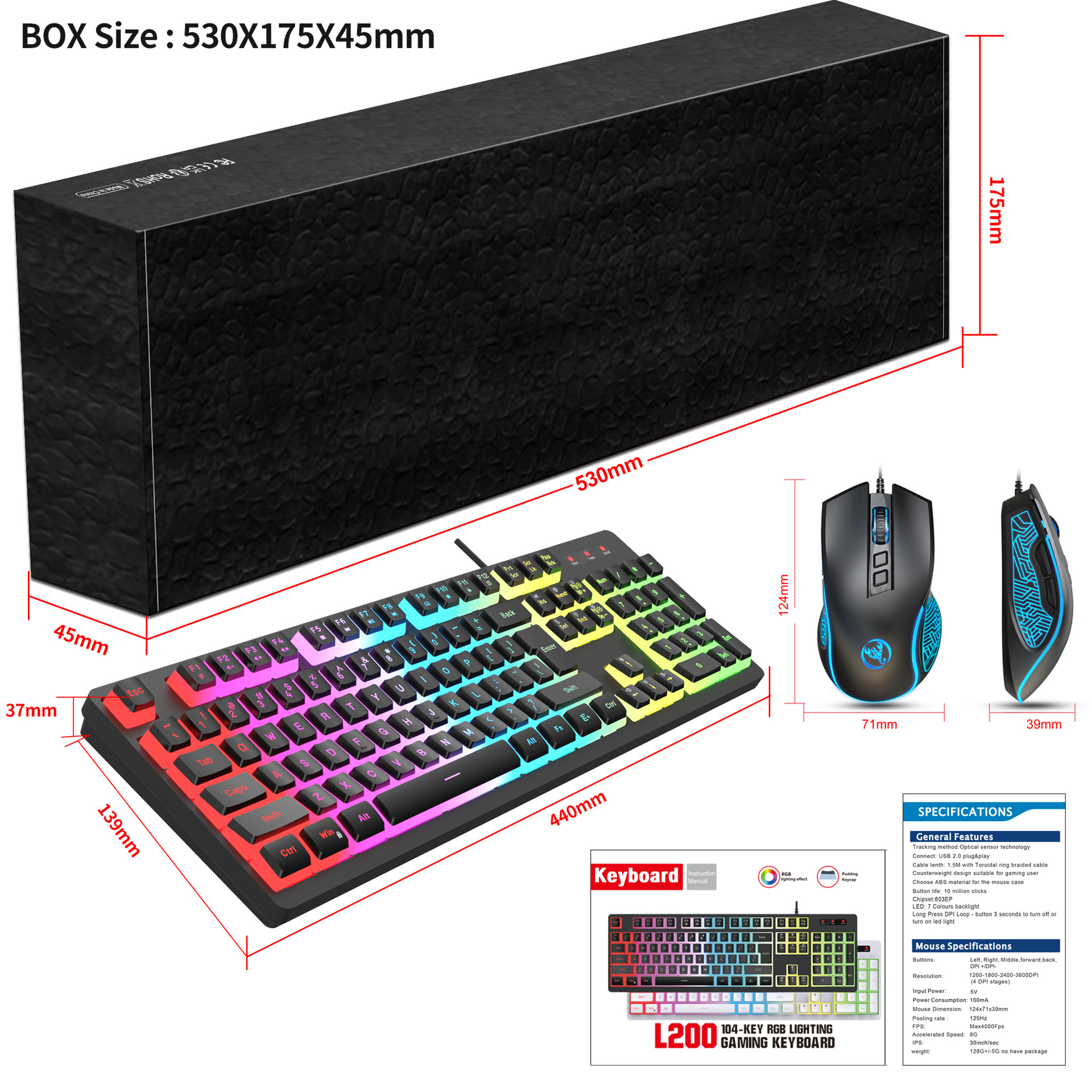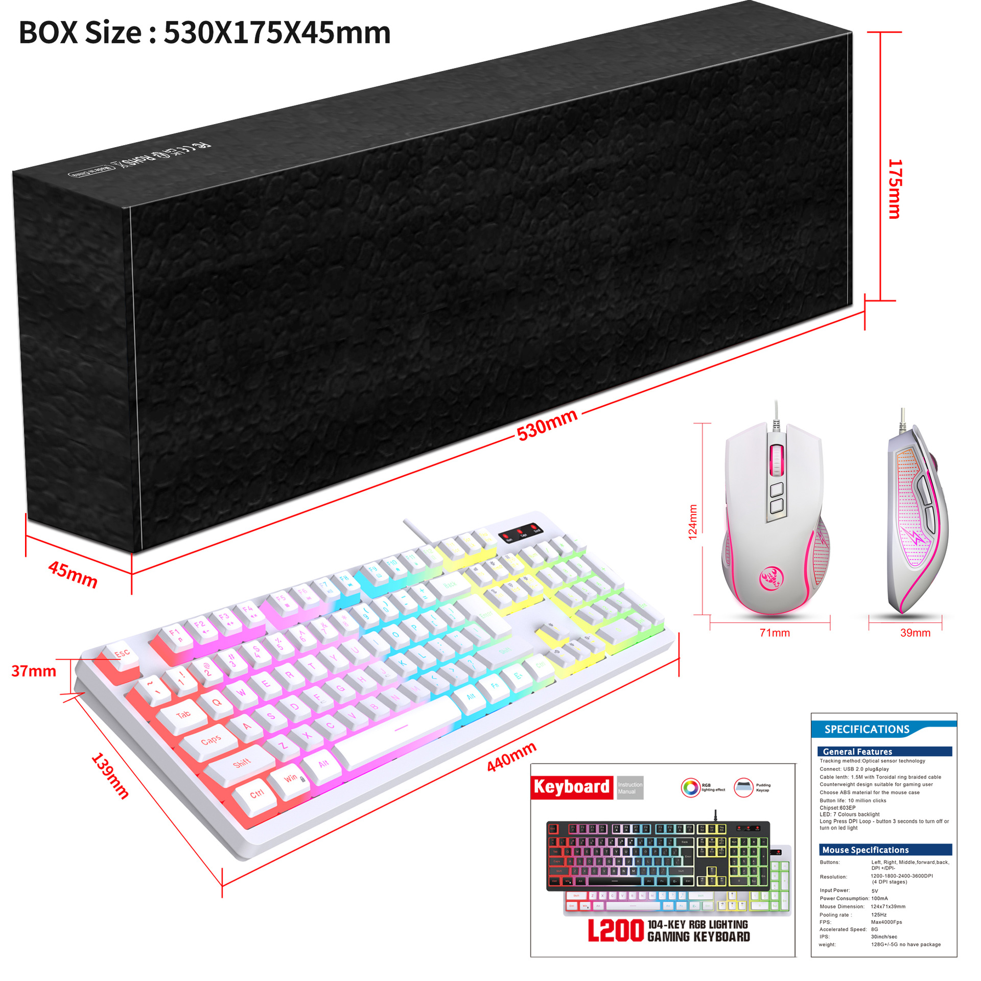 Specification item: 104 key RGB back lit game keyboard