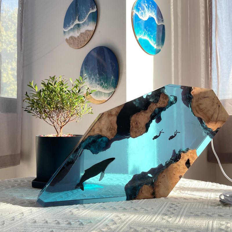 Lampe de table en bois et résine époxy, motif baleine à bosse, luminaire décoratif d'intérieur, idéal pour la fête des mères