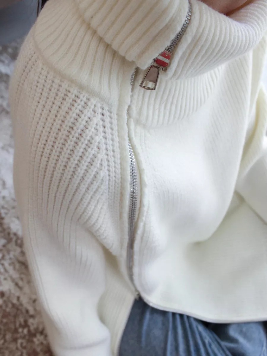 Lazy style high neck zipper solid color high-end knitted sweater for outerwear, loose long sleeved warm top for outerwear, trendy