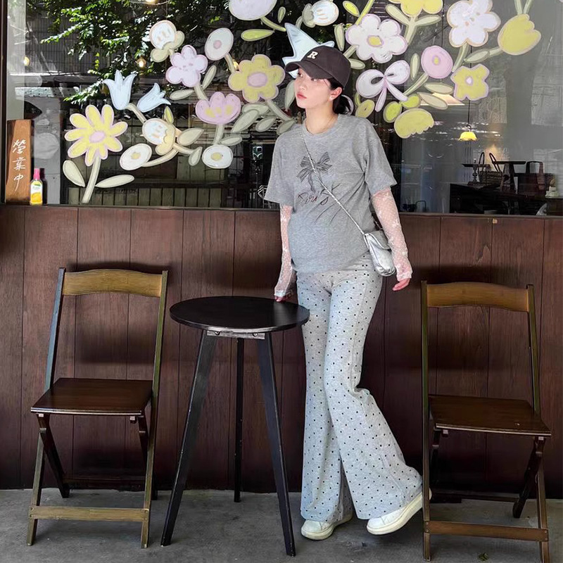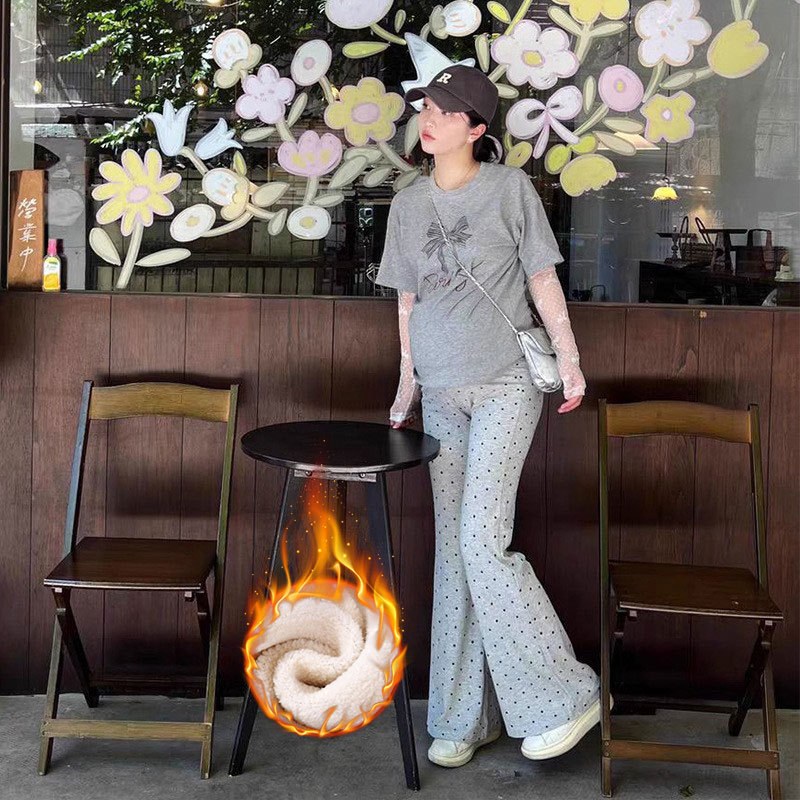 Maternity Pants Autumn Winter Polka Dot Flared Pants High Waist Belly Support Bell Bottom Long Pants Fleece Lined Pregnancy Maternity Autumn Wear