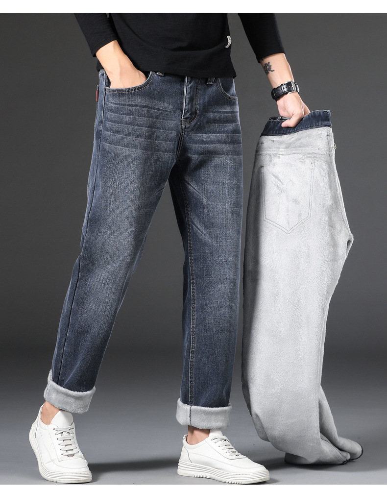 Jean d'hiver à jambe droite élastique pour hommes, coupe slim, avec denim pelucheux et épais, pantalons d'affaires extra gras et surdimensionnés pour hommes