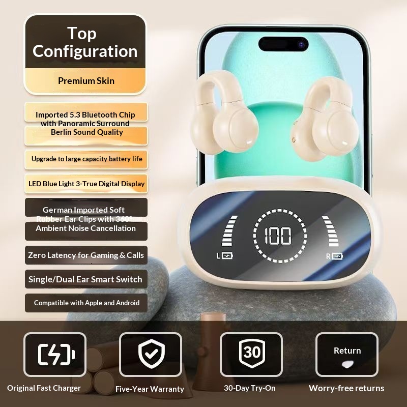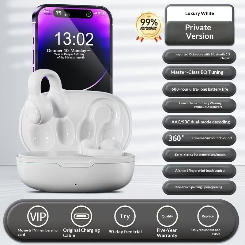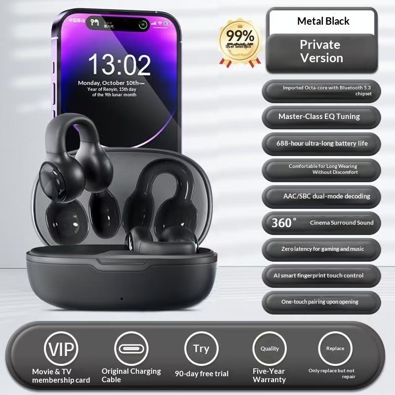 Brand:M47,Transmission Range:10m,Functionality:Noise reduction, bone conduction, breathing light, ultra-long battery life, call function, NFC function, voice control, supports music, sleep mode, digital display screen, gaming low latency, others,Bluetooth Protocol:5.0,How to use:Clip-on Earrings,Is it single or double ear?:Bilateral Stereo Sound,Color:Black, white, skin color,We have authorized private labels available:yes,Is it exclusively for cross-border export supply?:No,Customizable:Support,Is it a patented source product?:No,Mold Type:Private Model,What type of chip is it?:Jerry,Battery life:4-8 hours,Year/Season of Release:2024.3.16,Item Number:M59,Style:Sporty style,Waterproof performance:Waterproof for Daily Use,Bluetooth version:5.3,Material:PVC