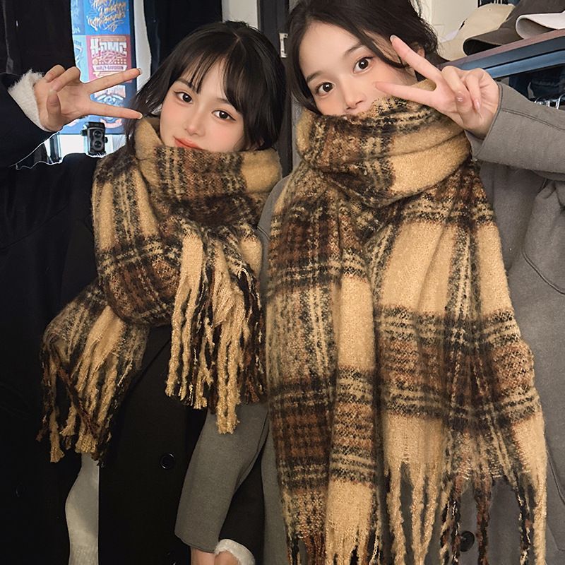 Nouvelle écharpe rétro Maillard polyvalente, chaude et épaisse, avec une atmosphère hivernale pour les couples, écharpe à pompon à carreaux pour femme