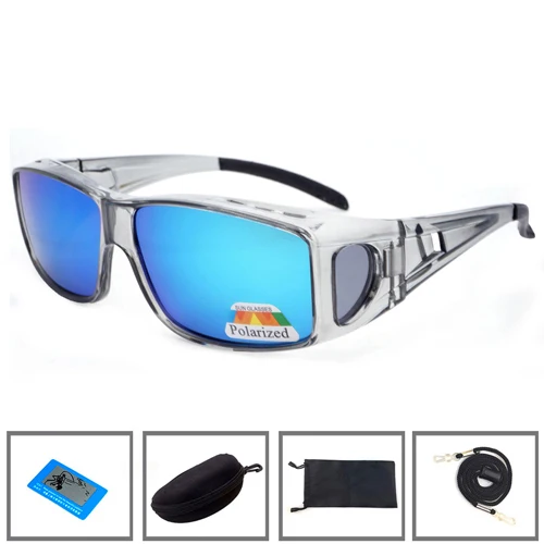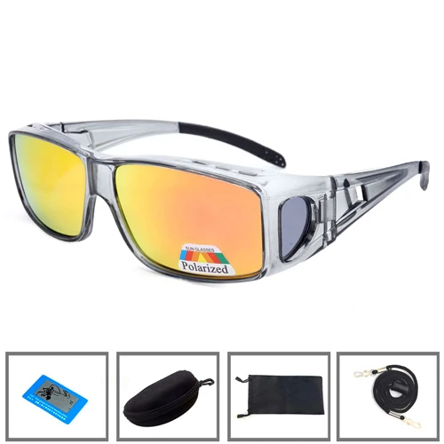 OVER GLASSES SUNGLASSES; High definition polarized lenses reduce sun glare and eliminate eye fatigue; Blocks 100% harmful UVA, UVB and UVC rays. SUPERLIGHT WRAPAROUND FRAME with smooth hinges ensures more comfortable fit than clip-on sunglasses. STREAMLINED LOOK; rectangle tinted lenses; matte finish black frame; much less bulky than old-fashioned over-sized fitovers. Super Comfortable Fitovers for Prescription Glasses Wearers Frame Material: Polycarbonate Lens: polarized lens Features: Anti-UVA anti-UVB polarized Lens Use: Riding ,Driving ,Fishing ,golf, Travelling