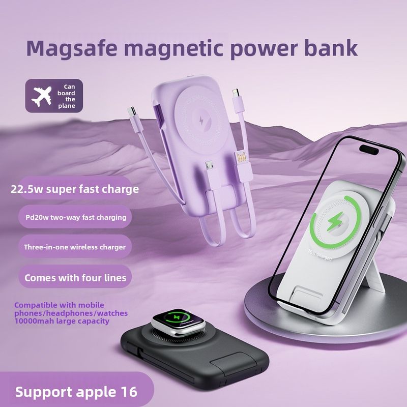 Nouvelle batterie externe magnétique sans fil 3-en-1 de 10 000 mAh avec charge rapide 22,5 W et support portable à quatre fils intégré.