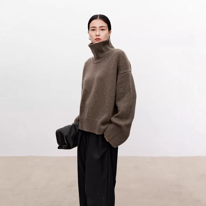 Autumn Winter High Neck Pullover Knitted Sweater for Women Long Sleeve Outerwear Loose Casual Solid Color Wool Sweater