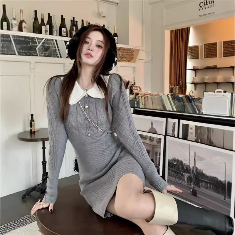 2024 Sweet and Spicy Sweater Dress for Women, Autumn and Winter New Style, Waist-Cinching Hot Girl Knitted Bodycon Dress, Short Gray Dress
