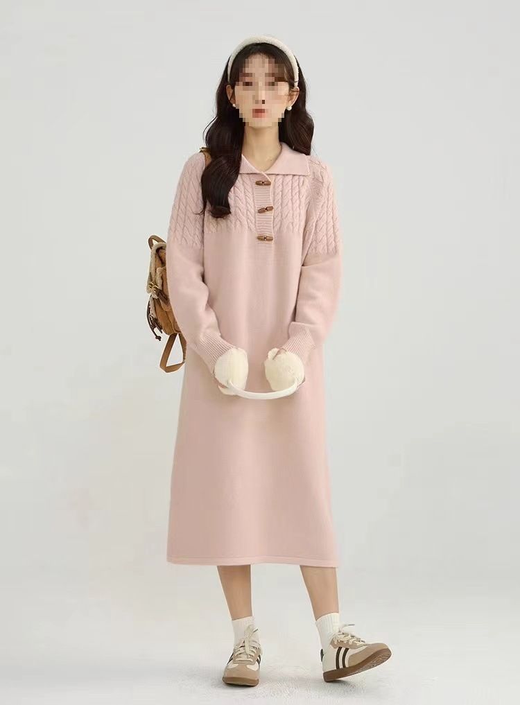 Turn-Down Collar Cable Knit Sweater Dress Women's Autumn Winter New Style Lazy Loose Thickened Wool Knitted Long Dress