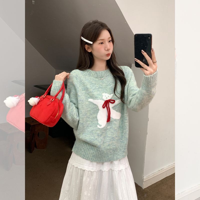 2025 Autumn Winter New Style Outfit Round Neck Thickened Warm Loose Cartoon Inner Knitted Women's Sweater Long Sleeve Top