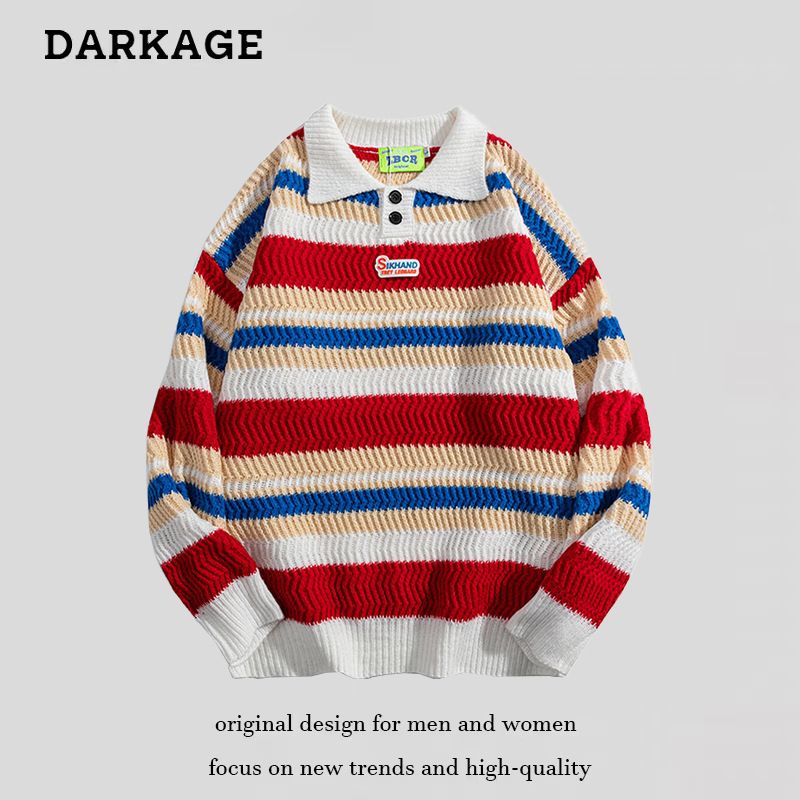 Pull oversize en tricot à rayures arc-en-ciel, col polo, unisexe, style décontracté, pour couple, automne-hiver, nouveauté