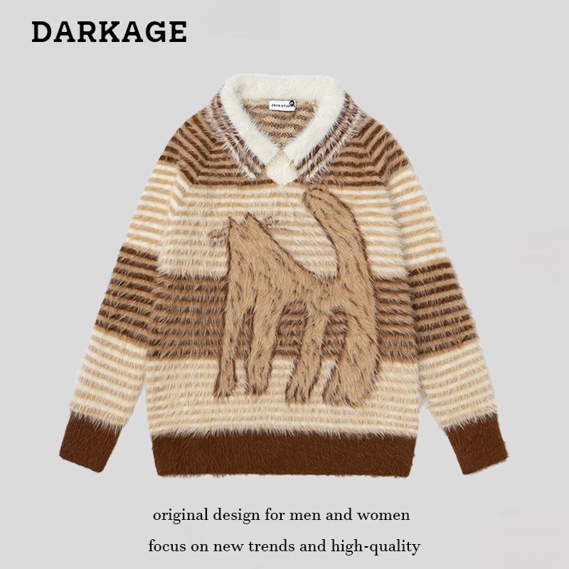 Fluffy Striped Kitten Fake Two-Piece V-Neck Sweater Unisex Autumn Loose Pullover Lazy Style Knitted Top