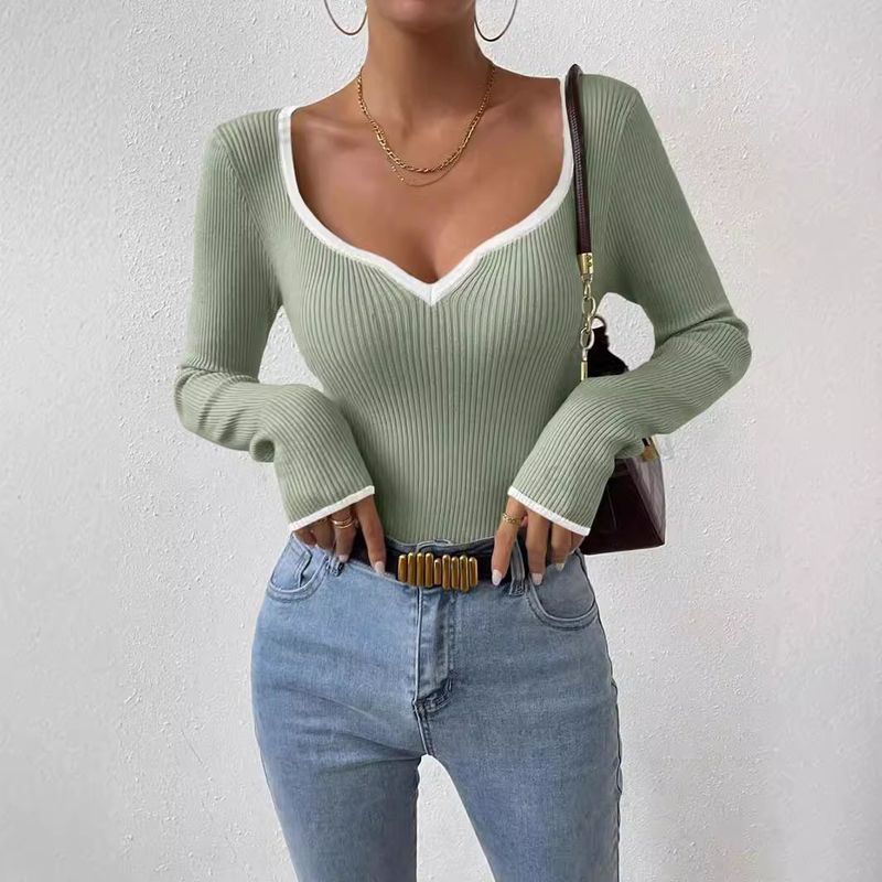 Spring and Autumn Fashion Trimmed V-Neck Knitted Sweater Women's Vertical Ribbed Slim Fit Base Shirt