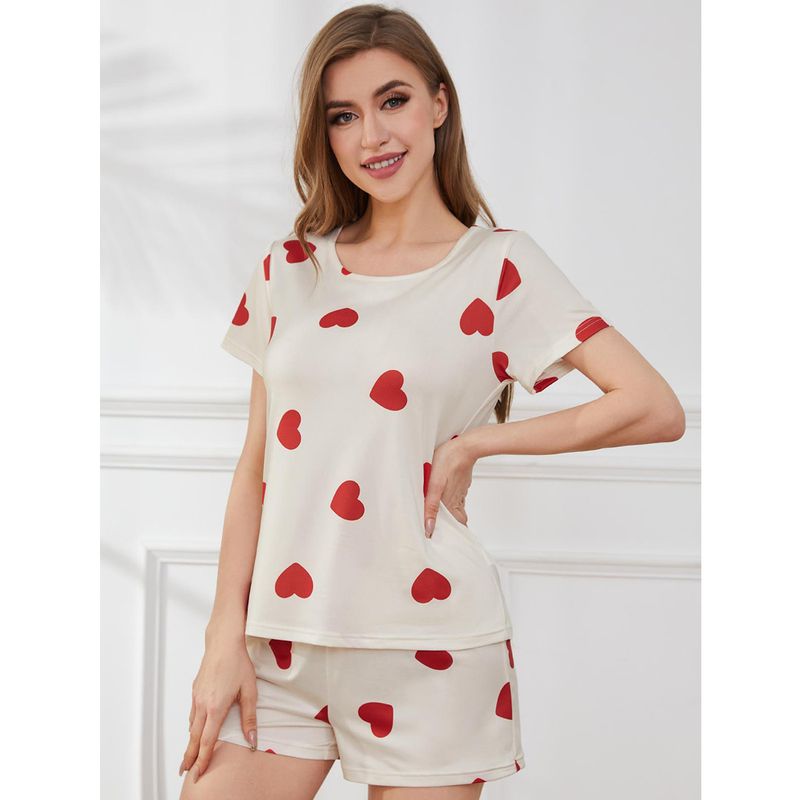 Pyjama deux pièces à manches courtes et short pour femme, vêtement d'été fin à cœur, vêtements de nuit