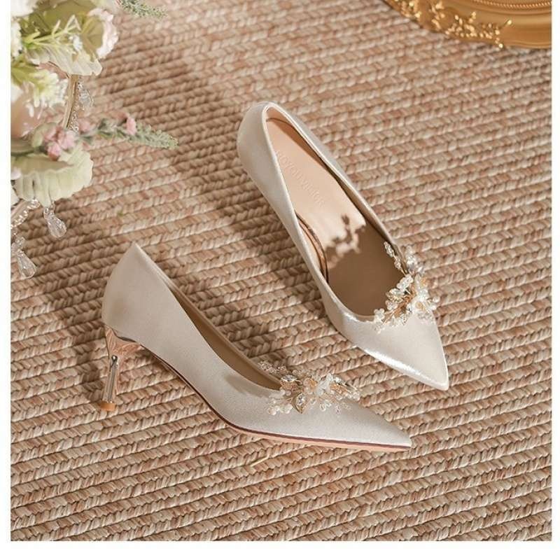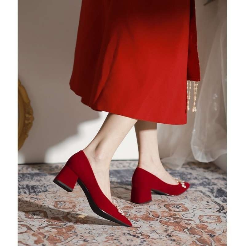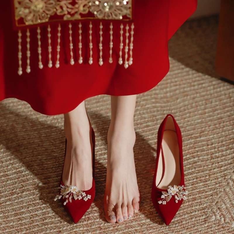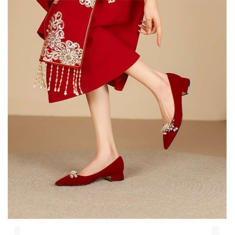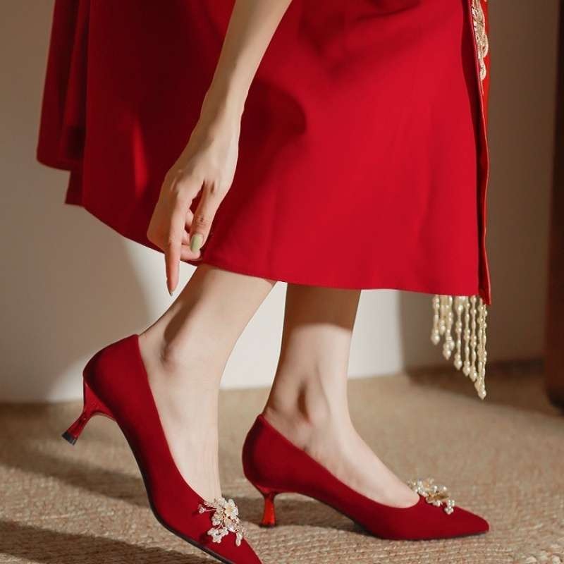 Chaussures de mariée rouges pour femme, idéales avec une robe Xiuhe, réversibles, fines et élégantes, collection 2025, style maternité.