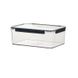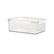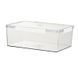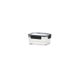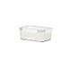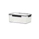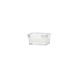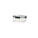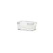 Boîte de conservation rectangulaire transparente en plastique pour fruits et légumes, idéale pour conserver la fraîcheur au réfrigérateur ou au congélateur.