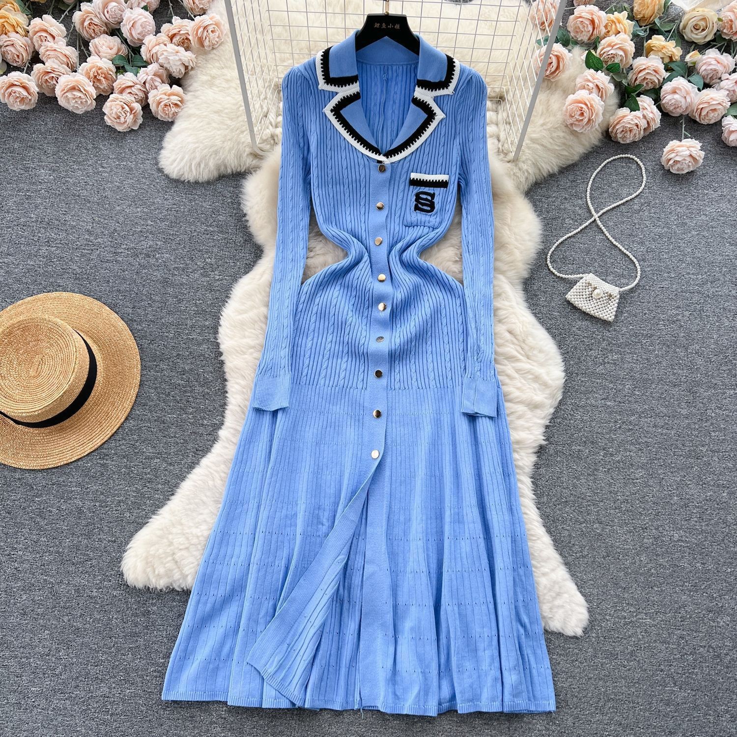 Cross-border AliExpress new color-blocked lapel knitted dress with letter embroidery, waist-cinching slimming sweater dress